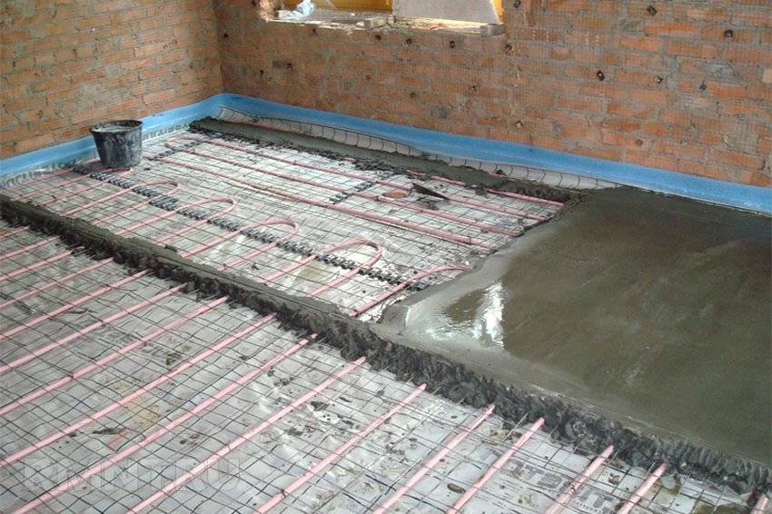 - Заливка стяжки. Поверх заполненной водой системы заливается обычная цементная стяжка, которую нужно оставить до полного застывания (обычно на это требуется около месяца). Когда раствор окончательно высохнет, можно будет запускать отопление в рабочем режиме. Преждевременный запуск системы с большой вероятностью приведет к повреждению бетонного слоя.