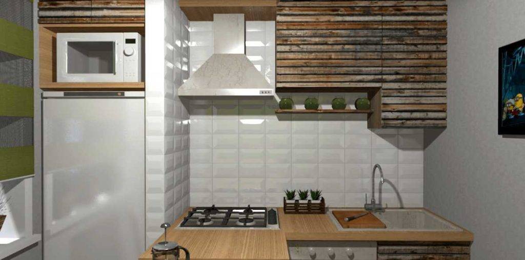 - Продумать удобство использования печи. Если холодильник относительно небольшой высоты, тогда можно на нем разместить микроволновку. Готовые к употреблению продукты можно будет с легкостью доставать;
