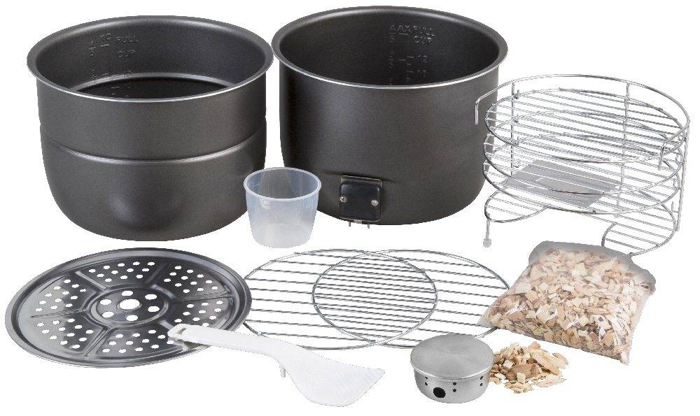 Также немаловажно задаться вопросом о количестве чаш, идущих в комплекте. Некоторые производители комбинированных скороварок, где есть режим копчения, предлагают 2-3 чаши