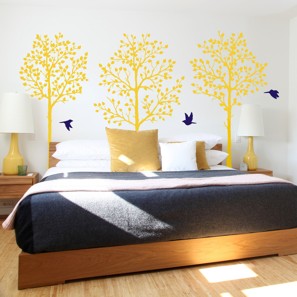 - С помощью правильно выбранного рисунка можно зрительно изменить площадь или конфигурацию комнаты, преобразить декор стен. Вертикальные изображения (например, стволы деревьев, Эйфелева башня) дают возможность визуально приподнять потолок, растягивая поверхность в высоту. Горизонтальные линии рисунка расширяют стены. Примеры таких наклеек, «работающих» с боковыми площадями, изображены на фото.