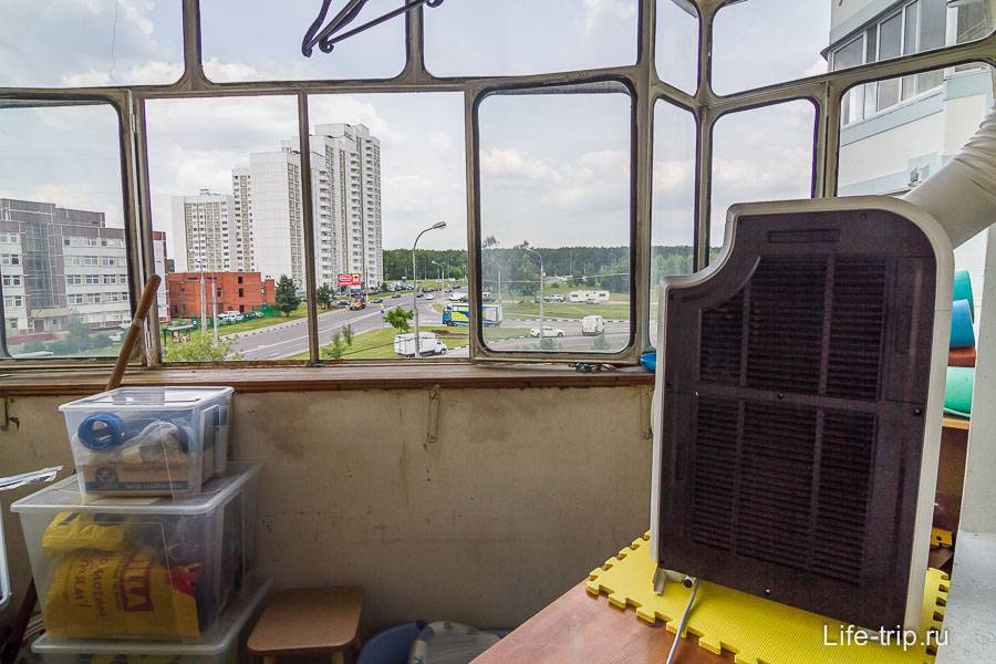 Сначала я попробовал поставить кондей в комнате и просто выкинул воздуховод в окно. К моему кондею прилагается еще комплект вставок для окна, и насадок, чтобы ставить воздуховод с любой стороны. Стало вполне прохладно по ощущениям, но термометр упорно показывал, что температура упала всего на 1-2 градуса или около того. Потом я воспользовался советами из интернета и поставил его на балкон около открытой балконной двери. Получалось, что он через проем двери дует холодным воздухом в комнату, а горячий выдувает на балкон. Видимо из-за такого большого проема, эффективность была тоже так себе, воздух успевал смешиваться. А чуть позже, я пришел к умозаключениям описанным выше, и начал думать как бы так правильно установить мобильный кондиционер. Теперь он стоит у меня за закрытой балконной дверью (стало гораздо тише) и довольно неплохо морозит. Чтобы долго не писать словами, покажу фотографии.
