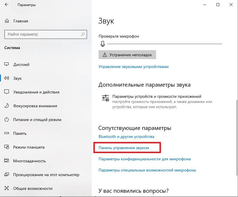 Не выходите из звуковых параметров, а перейдите в «Панель управления звуком».