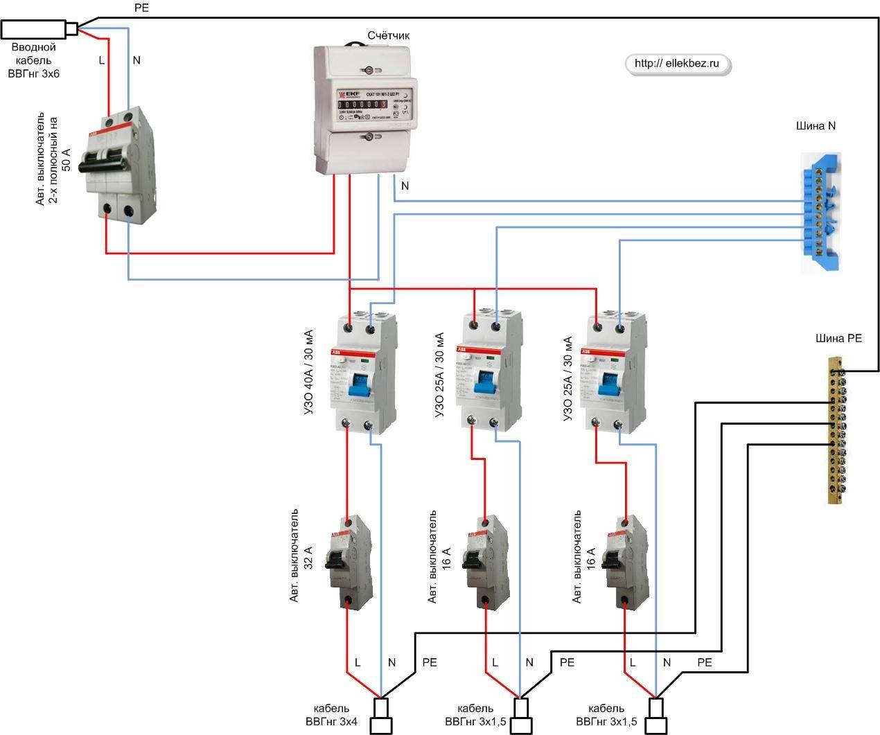 Через автоматический выключатель подключают фазный провод, заземляющий и нейтральный проводник, на осветительные приборы и розетки проходит напрямую.
