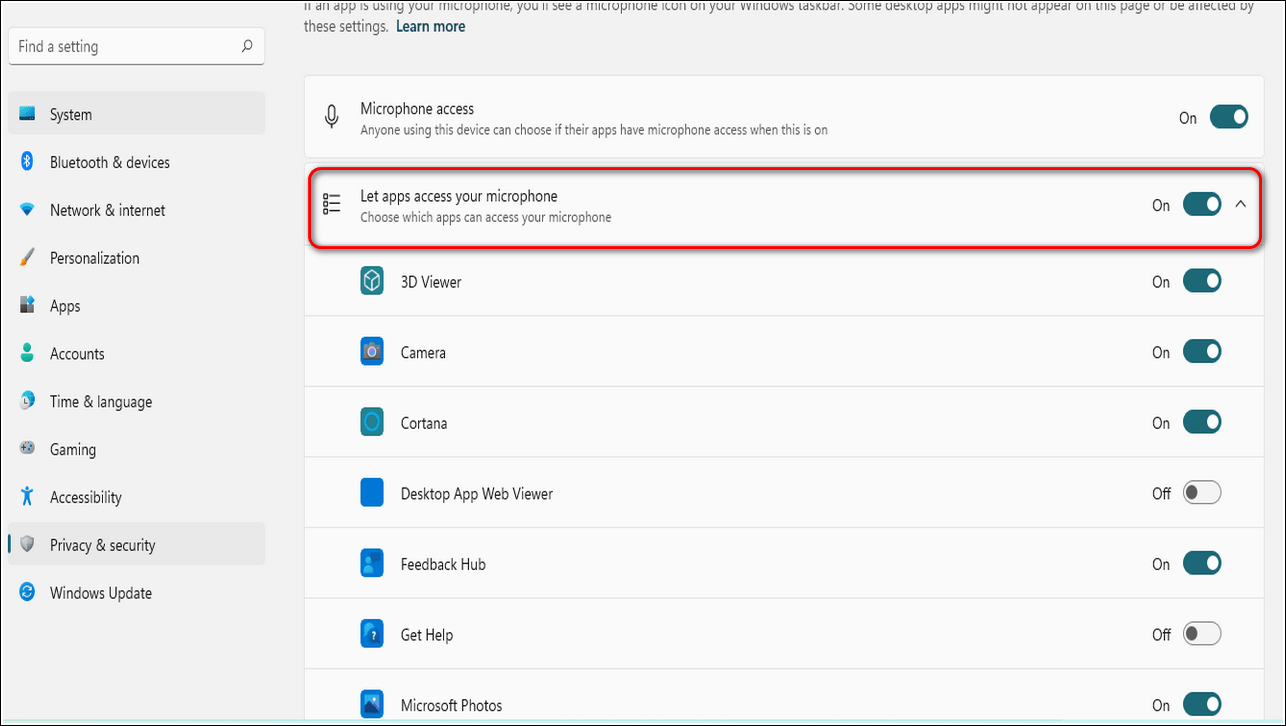 Убедитесь, что параметр Разрешить приложениям доступ к вашему микрофону включен.
