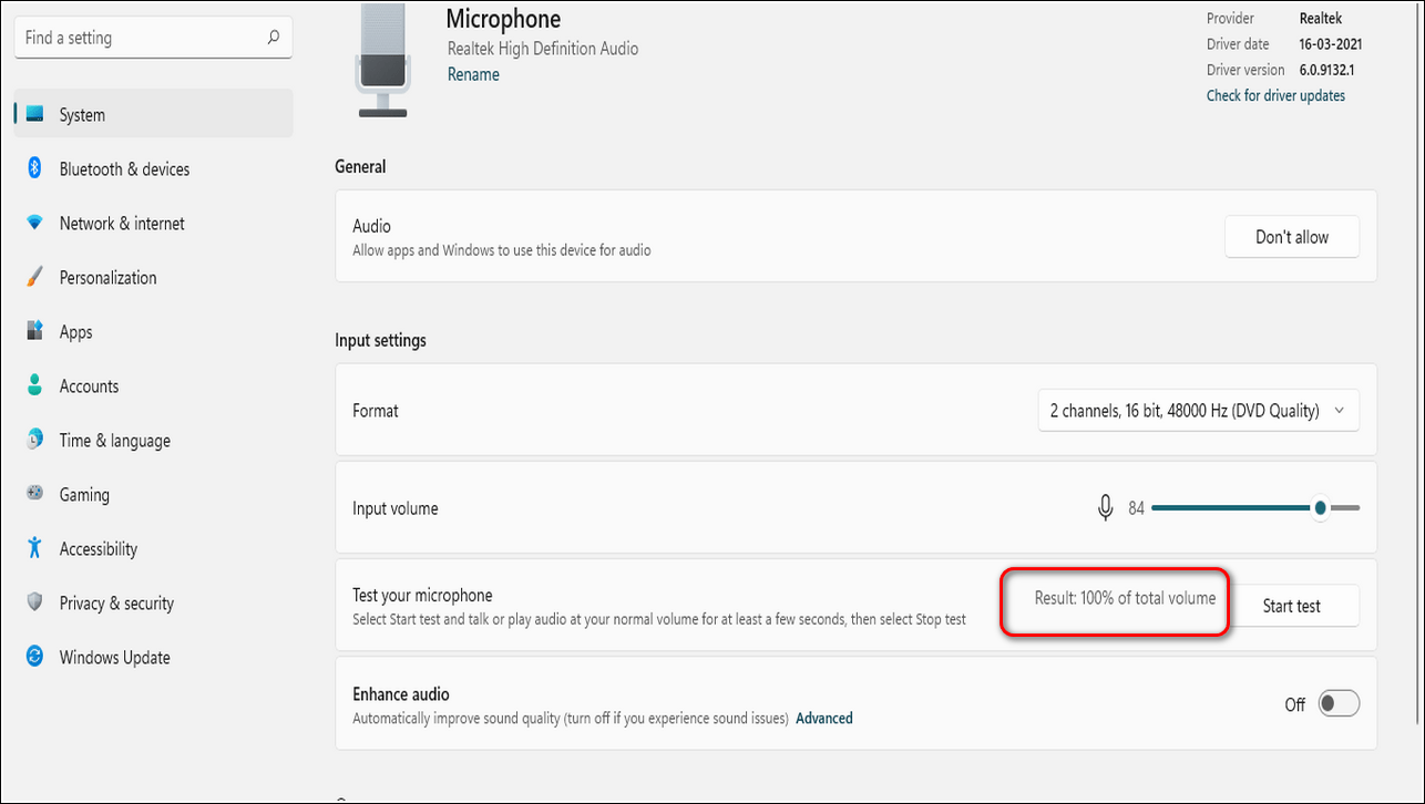 - Если микрофон работает нормально, вы должны получить 100% результат.