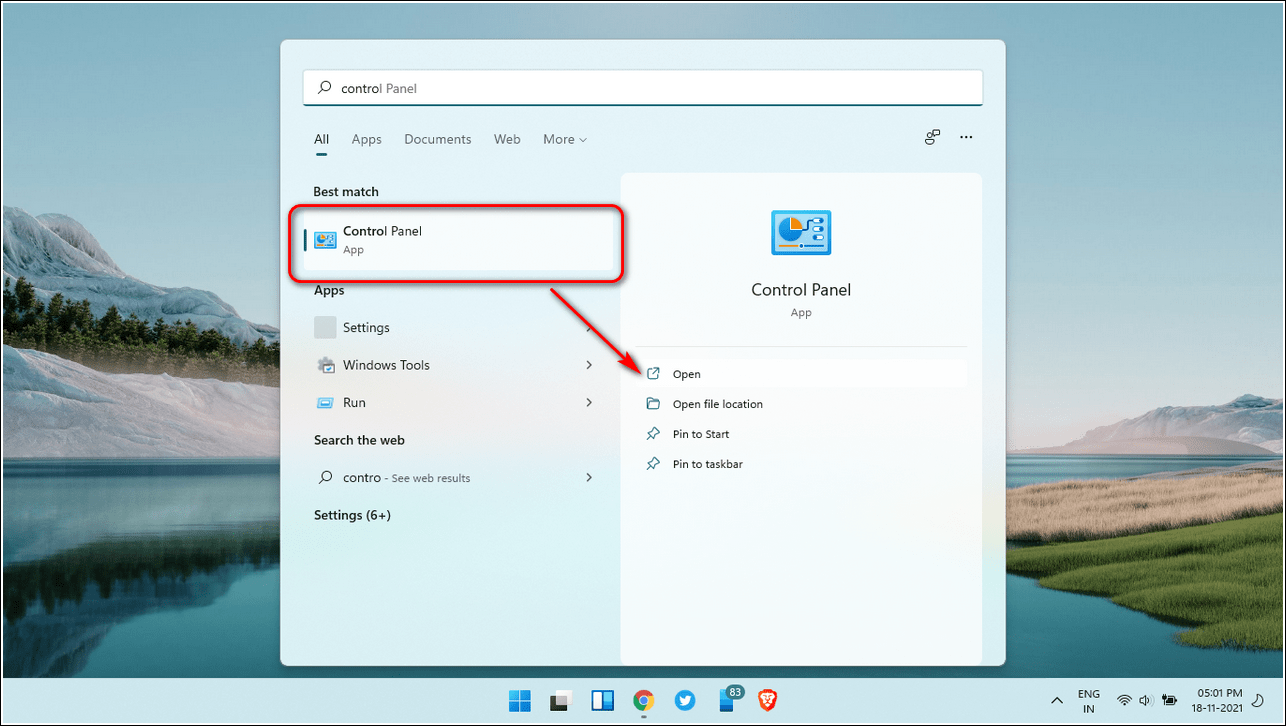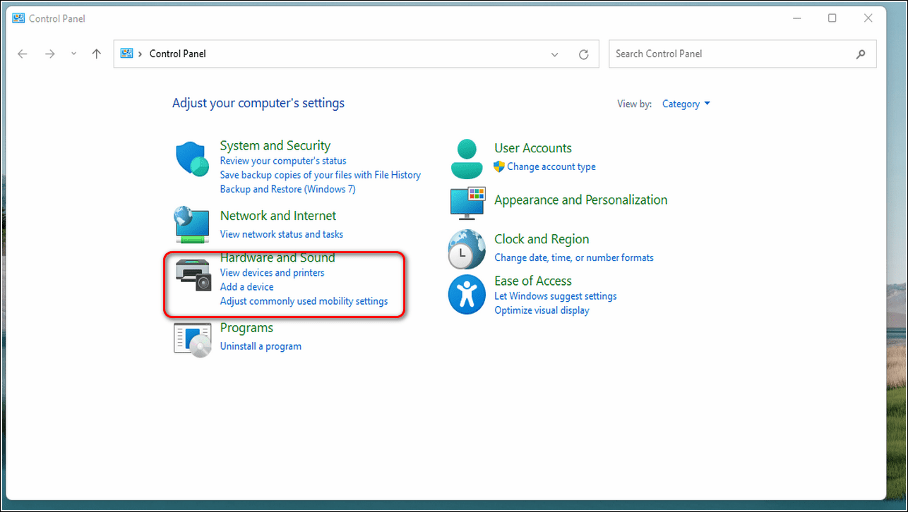 - Щелкните Оборудование и звук и откройте параметр Звук.