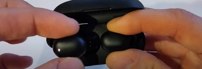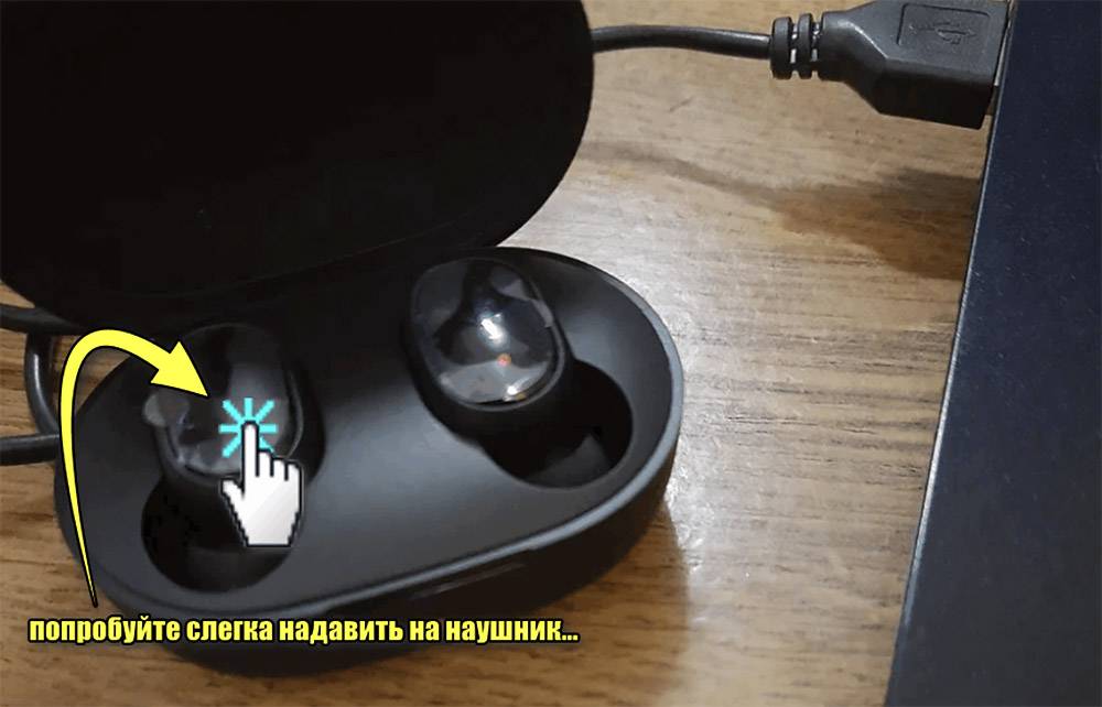 Решение: нажать на кнопку и одновременно с этим положить наушник в зарядной кейс. Просто зажимаем сенсорную кнопку и не отпуская ее кладем нерабочий наушник в зарядной кейс немного прижимая его.