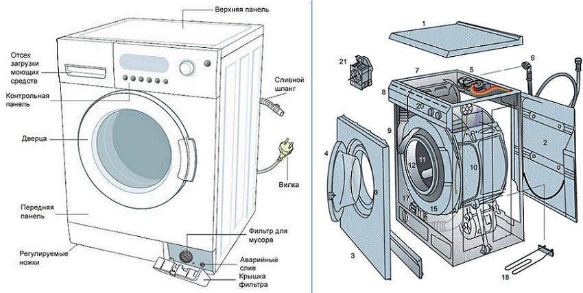 Если после включения код не исчез, нужно продолжать поиски. На фото показано устройство стиральной машины Candy, чтобы вам было проще ориентироваться.