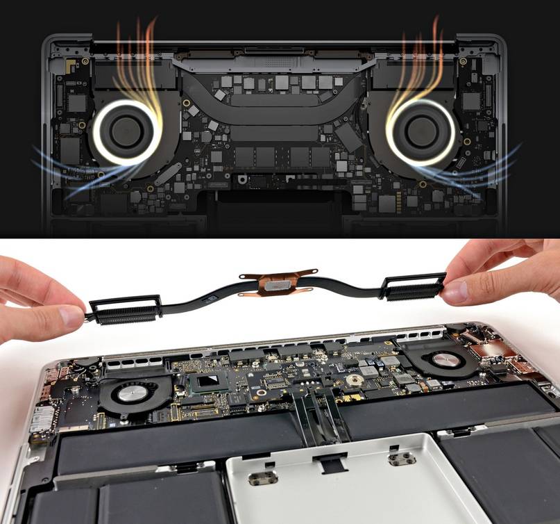 Вторая важная часть — тепловые трубки! По ним тепло отводится от горячих элементов системы (процессор и видео карта) к кулерам! Чем больше трубок, тем эффективнее тепло отводится и охлаждается!