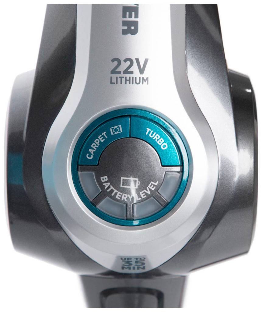 Как мы уже говорили ранее, одного заряда батареи хватит для уборки одной большой комнаты или же малосемейной квартиры. Для площади более 50 квадратных метров лучше приобрести дополнительную батарею для возможности быстрой замены. На самом верху моторного блока располагается кнопка, активирующая турбо-режим. При использовании максимальной мощности можно с легкостью убирать ковры, паласы, ковролин, различные сильные загрязнения. Для простой уборки лучше всего зажимать кнопку под рукояткой пылесоса.
