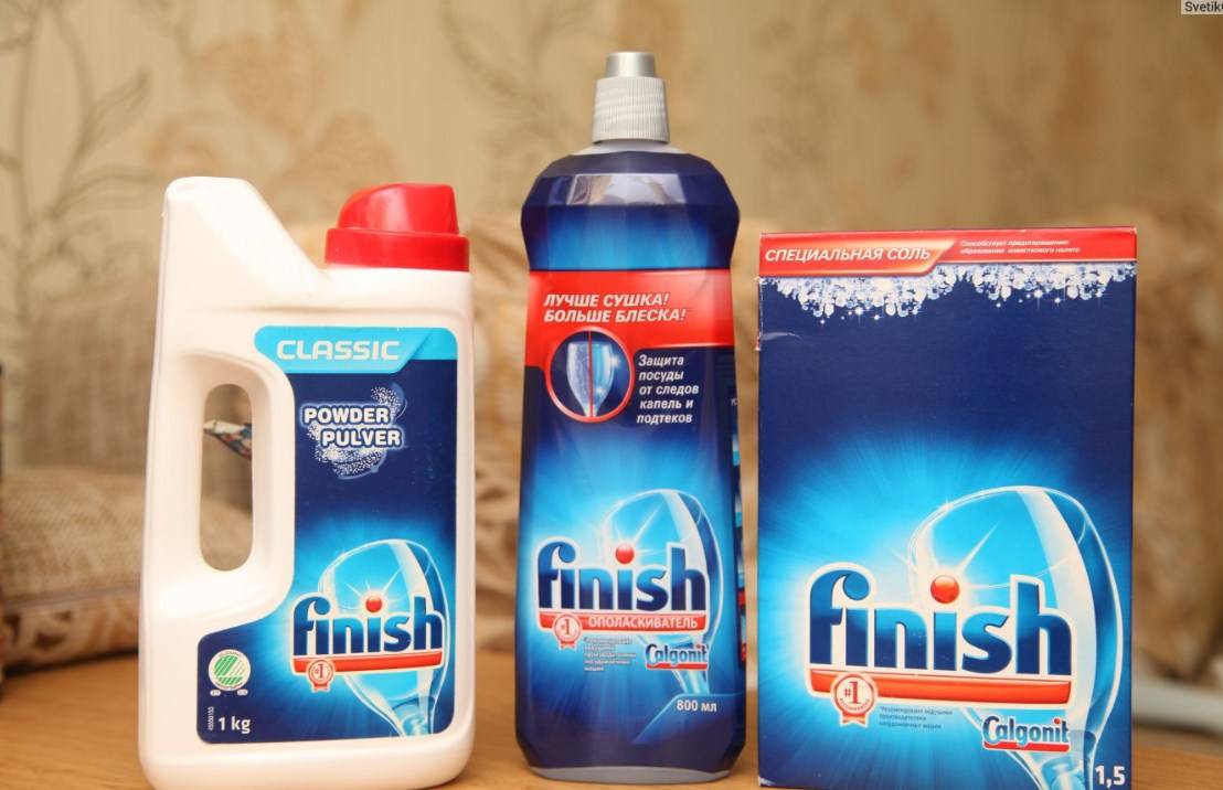 Обслуживание – чтобы посудомойка делала свою работу, ей необходимы моющие средства. Это могут быть как универсальные таблетки (например, Finish 3 в 1), так и отдельные составляющие (соль, кондиционер, порошок), которые нужно покупать. Первый вариант удобнее, но дороже, второй же – наоборот;