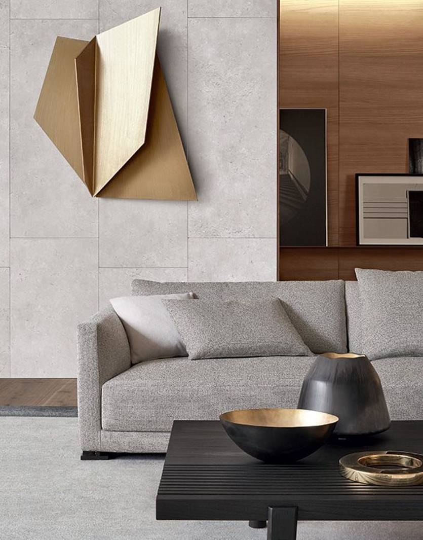 Их поверхность должна быть идеальной гладкости и монохромного цветового решения. Каким конкретно способом их оформить вы можете решить сами. Выбор фактуры материала ничем не ограничен. Сегодня модно использовать в декоре зала жидкие обои или под покраску, рельефную штукатурку и стеновые панели. Последние лучше брать деревянные, бамбуковые или пробковые. Можно декорировать стены под гладкий бетон. Такие монохромные поверхности, без всяческого декора, станут безупречным фоновым решением для создания минималистической интерьерной композиции.