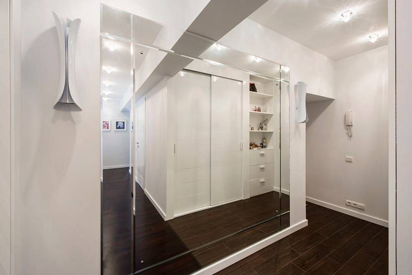 Белый цвет в отделке зрительно расширяет пространство, большие зеркала ломают границы комнаты, свет формирует нужную легкость и устраняет ощущение замкнутости и сжатости.