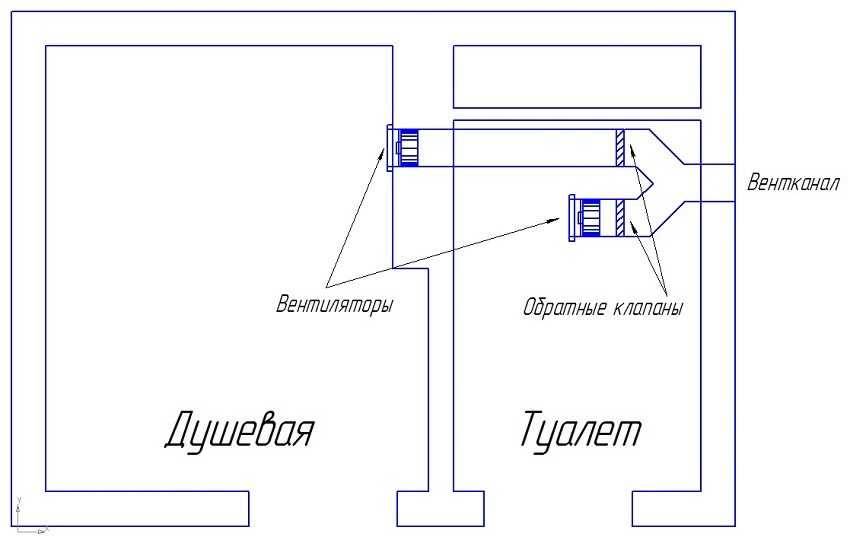 Санузел и ванную обычно оборудуют собственными вентшахтами. Обратный клапан ставят на вход. Вывод воздуха осуществляется естественным путем, но при опрокидывании клапан блокирует обратное движение. Если канал есть только в туалете, как в старых домах, клапанное приспособление монтируют не на вход в туалете, а в канал между ванной и санузлом.