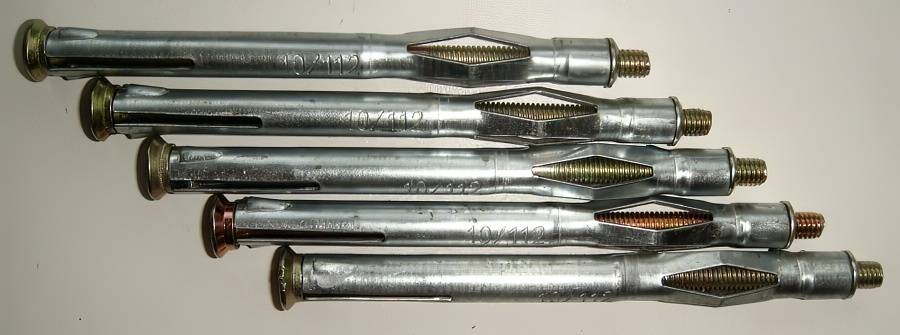Клиновые крепежи представляют собой длинный стержень, на конце которого размещена деформационная гильза. После завинчивания стержня в высверленное отверстие происходит расширение лепестков гильзы. Данный вид крепежа способен выдерживать большие нагрузки.