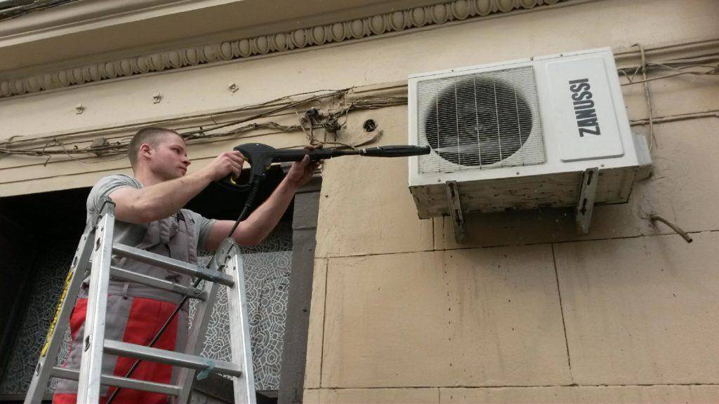 Особенностью обслуживания внешних модулей является то, что самостоятельно почистить можно лишь блок, смонтированный в доступной близости. В остальных случаях, всё же придётся прибегнуть к услугам сервисных мастеров, имеющих допуск для работы на высоте