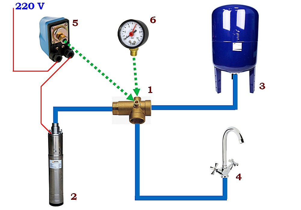 - Насос. Для подачи воды из скважины применяются погружные или поверхностные модели.