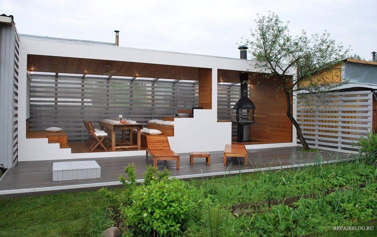 Отличным решением выступает комбинированный пол, когда зона мангала или барбекю имеет прочный бетонный пол, а гостевая зона использует деревянный настил.