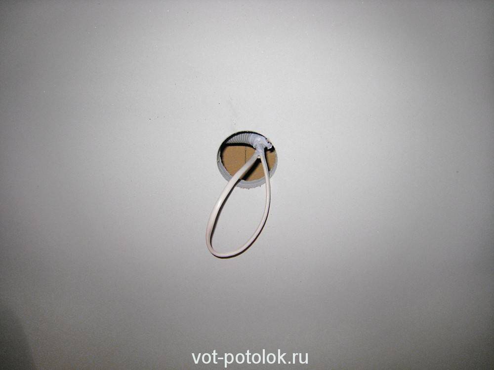 В отверстия под точечные светильники выводятся петли провода освещения. Петля режется пополам, концы провода зачищают ножом и к ним подключают точечный светильник. После этого отжав пружины, его устанавливают в отверстие.