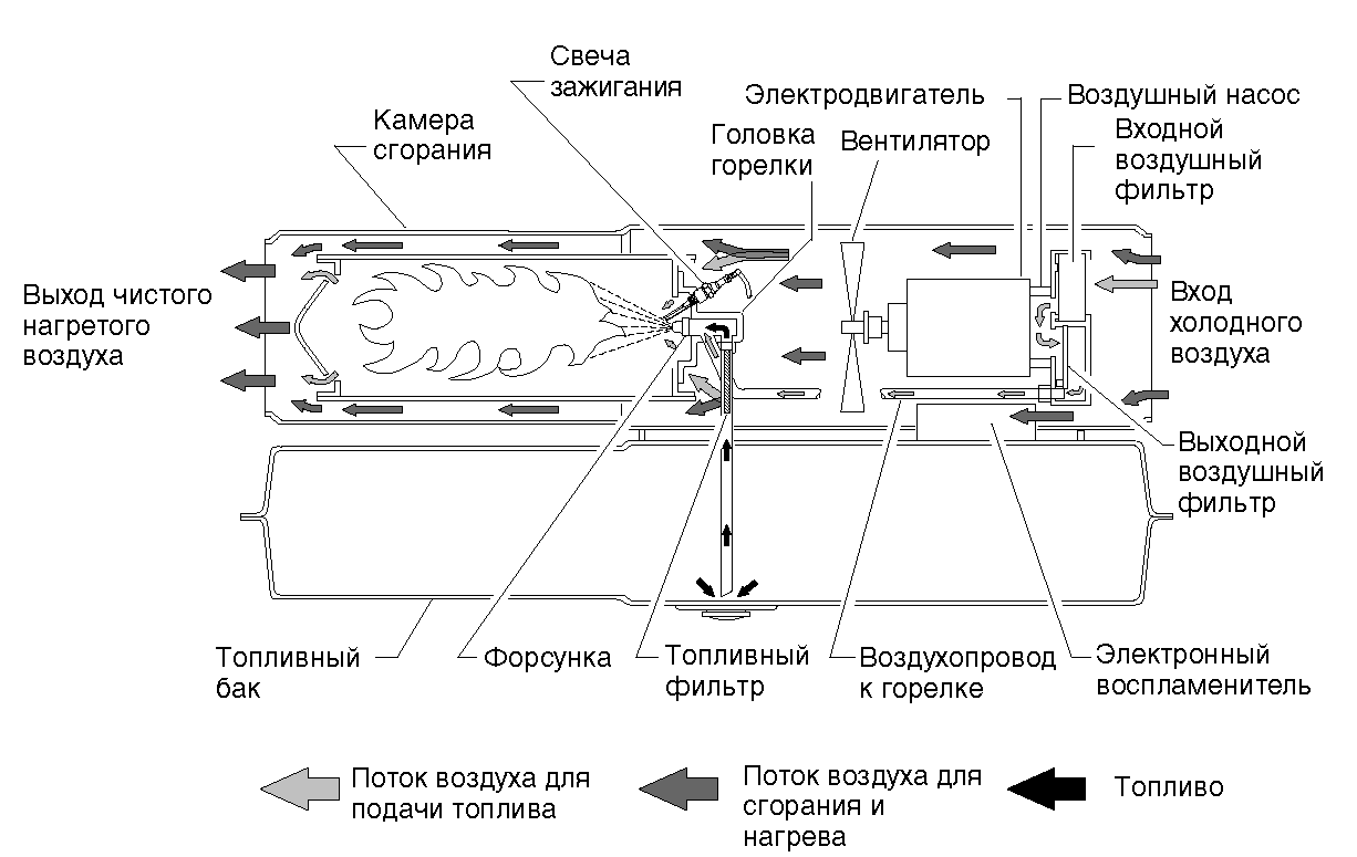 Любые модели дизельных обогревателей состоят из следующих элементов: