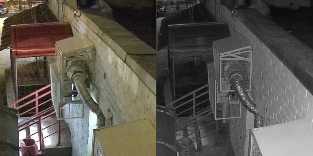 Для цветного формата банально не хватает окружающего освещения, а включить фонари на самой камере без объявления тревоги и весьма громкой сигнализации нельзя. Так что для ночных условий лучше использовать чёрно-белый режим. Если что, камера сама умеет переключаться в нужный режим, когда окружающего освещения недостаточно.