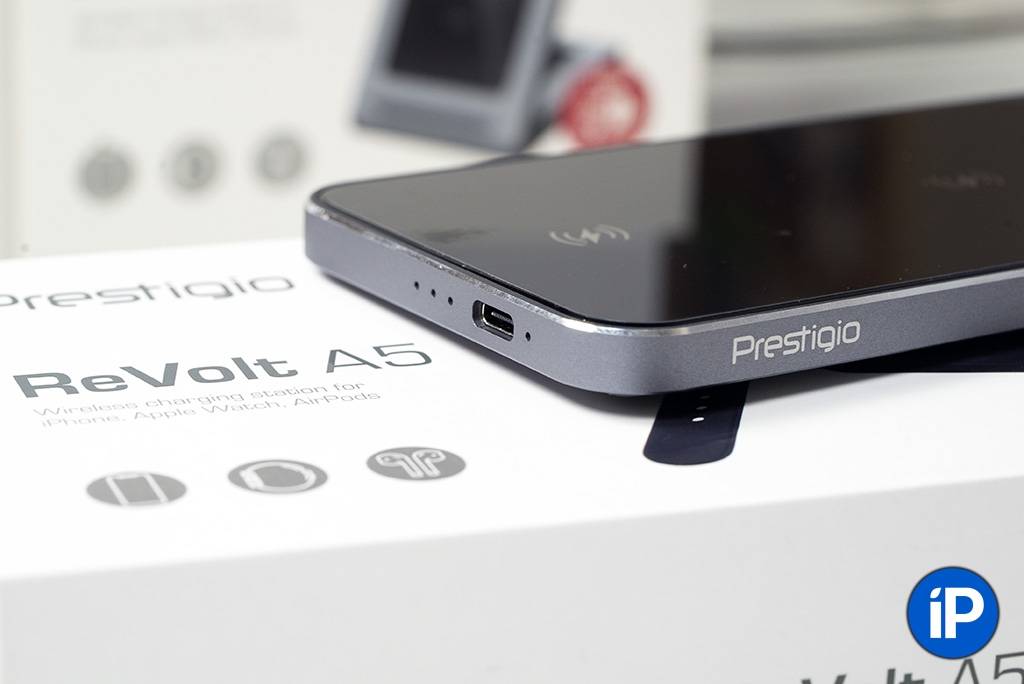 ReVolt A5 может заряжать беспроводным способом три гаджета одновременно: совместимые iPhone, AirPods, а также имеет встроенную зарядку для Apple Watch. Всё это спрятано в корпусе из цельного куска алюминия, а контактная площадка покрыта защитным закалённым стеклом.