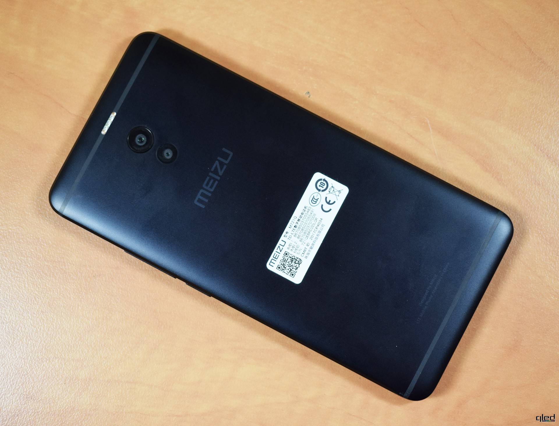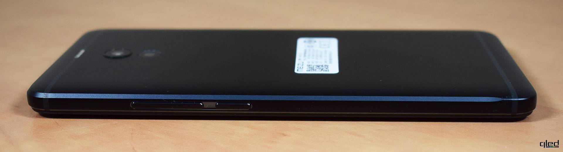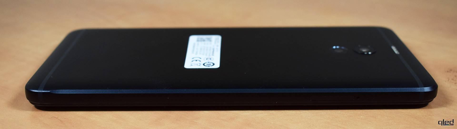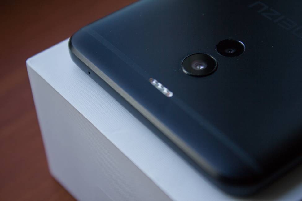 С обратной стороны смартфон выглядит намного интереснее. Модуль из двух камер расположен там, где обычно у смартфонов Meizu располагается камера со вспышкой. Исключением является всего несколько устройств этого и прошлого года. Основная камера слегка выступает над корпусом и имеет металлическую окантовку. Вторая наоборот слегка утоплена. Над камерами в пластиковую полоску для прохождения сигнала антенн встроена четырёхдиодная двухцветная вспышка. Кроме первоочередной функции, она также может оповещать пользователя о различных событиях во время их наступления, поочерёдно включая диоды. Выглядит очень эффектно. Хоть полоски и не пытались замаскировать на краях корпуса, как это сейчас делают многие производители, но к ним ни каких претензий нет. Подгонка идеальная. Шов практически не ощущается.
