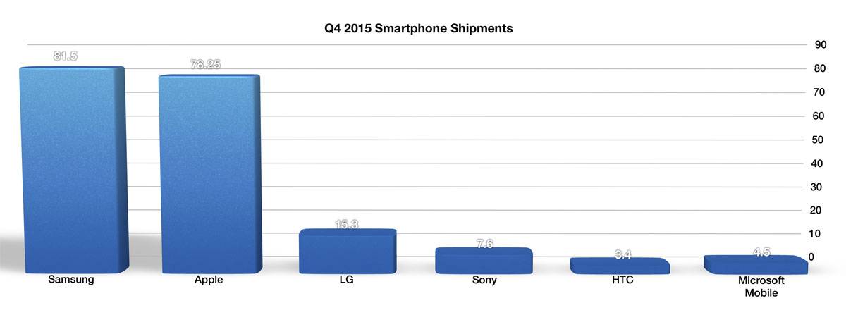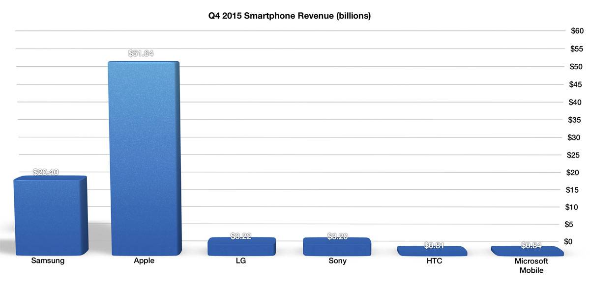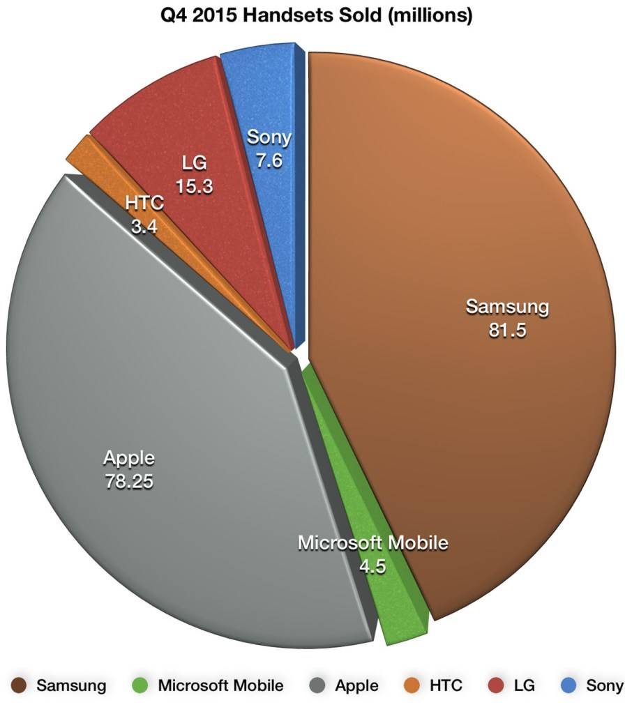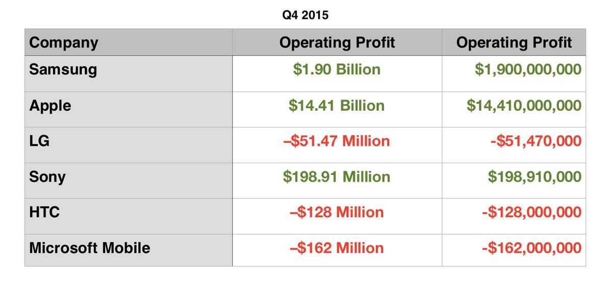 Диаграмма и таблица выше показывают разницу в продажах между Sony, Apple, Samsung и LG в 4-м квартале 2015 года. Sony смогли обогнать только HTC и Microsoft Mobile, хотя уровень прибыли у них больше, чем у LG.
