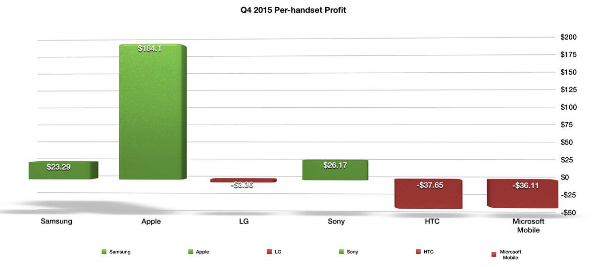 Ниже вы можете увидеть, сколько денег каждый производитель зарабатывает (или теряет) на каждом проданном телефоне.