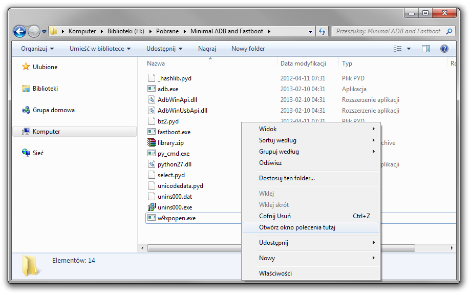 Удерживайте нажатой клавишу Shift на клавиатуре, затем щелкните правой кнопкой мыши внутри папки Fastboot. В контекстном меню выберите «Откройте здесь окно команд».