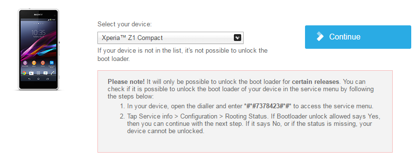 первый перейдите на страницу разблокировки загрузчика SONY и выберите модель вашего устройства в самом низу (Z1 Compact). Нажмите «Продолжить» идти дальше.