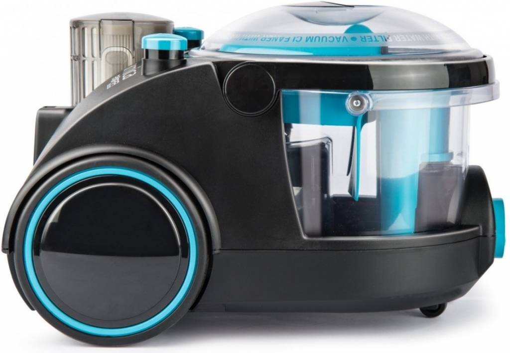 Пылесос с вместительным мусоросборником, аквафильтром и НЕРА комплектуется телескопической трубой и многочисленными насадками для разных поверхностей. Отличается маневренностью, есть регулятор настройки мощности и индикатор наполненности водного резервуара. В устройстве предусмотрен антибактериальный ароматизатор.