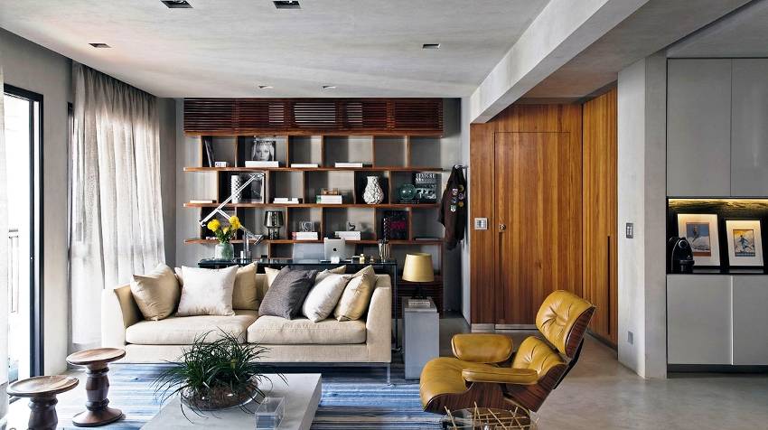 Интересными являются конструкции от пола до потолка, оснащенные небольшим количеством неглубоких полочек. Декоративность и разделение помещений – их основная функция.