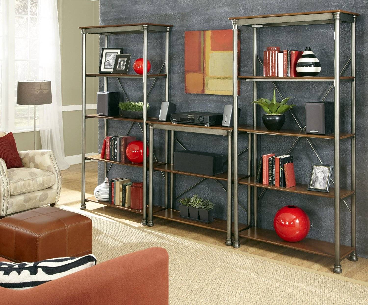 Есть и более солидные системы стеллажей, представляющие собой, по сути, книжные шкафы или мини-стенки. Такие стеллажи имеют боковые стенки и часто заднюю. Длинные полки разделены перегородками на секции. Часть полок может быть закрыта дверцами. Понизу могут быть расположены тумбы или комоды, а в центре стеллажа — место под телевизор.
