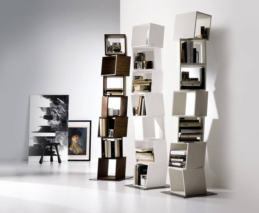 Оригинальность модели стеллажа обеспечивается и асимметричностью, а также ступенчатостью расположения полок и перегородок. В современных моделях можно обнаружить присутствие зигзагообразности, криволинейности и округлости. Если стеллаж для дома изготавливается на заказ, хозяева могут проявить фантазию и создать действительно уникальную и неповторимую модель. Стоит иметь в виду, что для классических интерьеров такие модерновые стеллажи не подходят.
