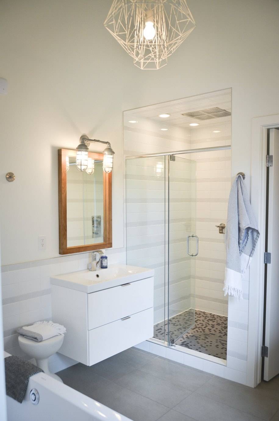 Освещение в санузле без окон должно равномерно рассеиваться по комнате. Иногда совмещают 2-3 вида ламп в одной стилистике. Для каждой зоны стоит выбрать определенное световое решение.