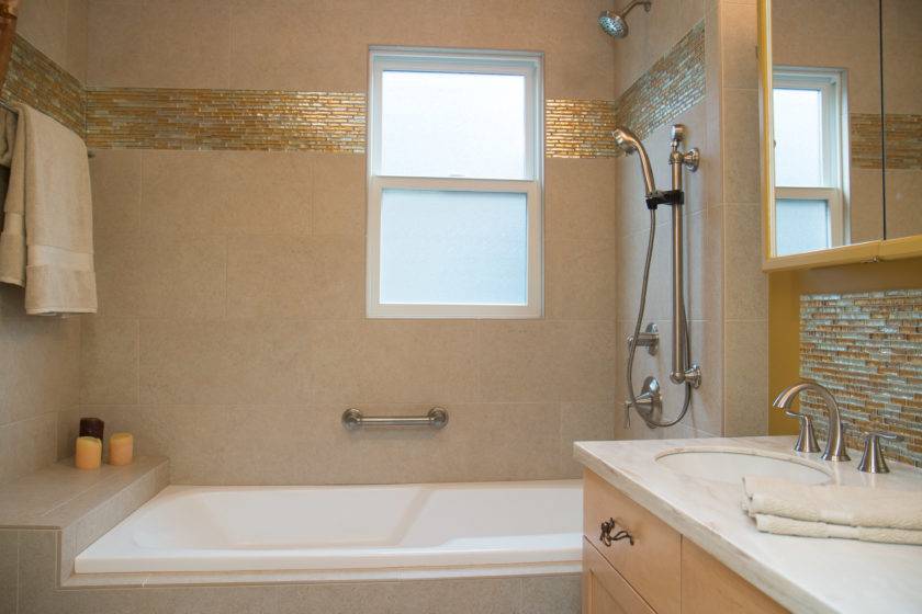 Дизайн ванной комнаты с имитацией дерева и отделкой стен мозаичной плиткой