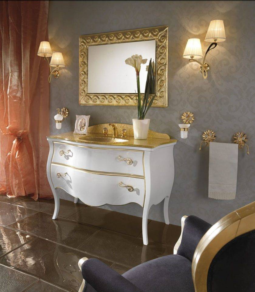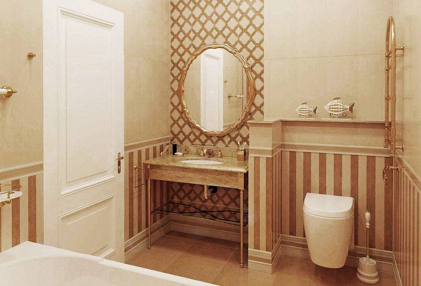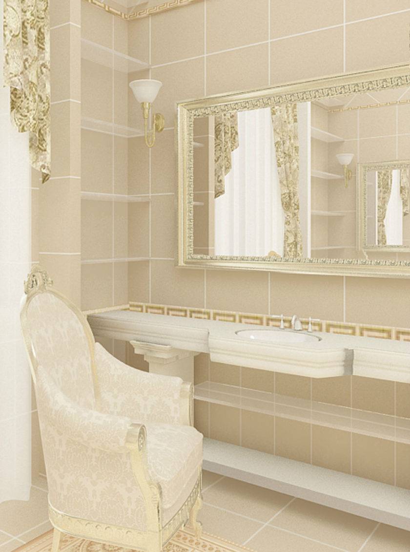 - Классика – характеризуется наличием яркой позолоты и крупных объектов декора (картин, панно), а также оформлением комнаты в светлой палитре и теплых коричневых тонах. В качестве напольного покрытия применяется плитка с узором под мрамор и кафель со сложным орнаментом. Рекомендуется повесить большие зеркала в фигурной позолоченной оправе, люстры. Мебель должна быть изготовлена из светлого дерева.
