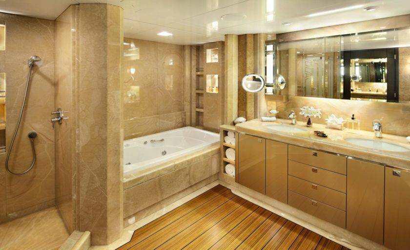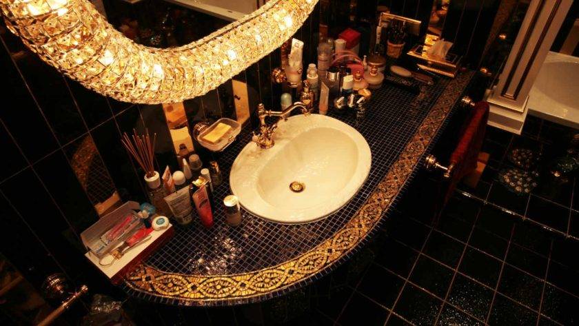 Если рассматривать этот цвет в золотой ванной комнате, а особенно его светлые оттенки, то можно сказать это будет очень удачный выбор, даже для не больших помещений.
