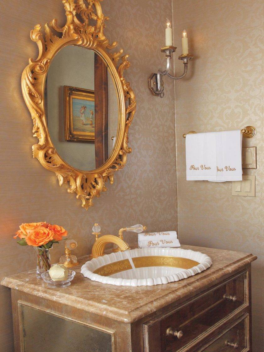 Барокко – подходит только для больших просторных ванных комнат, в маленьких такой интерьер будет слишком нагруженным. Для реализации используются бордовые, темные коричневые оттенки, картины и зеркала оформляются в крупных фигурных темных позолоченных оправах. Отделка выполняется плиткой с матовым покрытием или обоями со сложным узором.