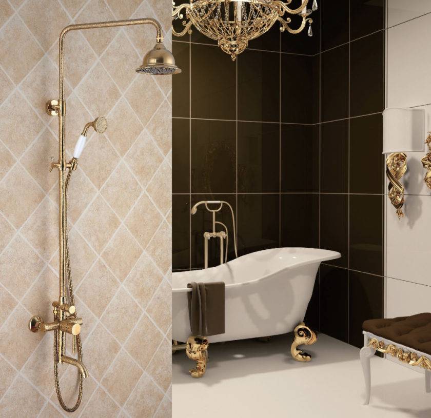 Так же показать ее роскошь можно с помощью дополнительных элементов. Используя, например золотые смесители для ванной, золотую штору для ванной.