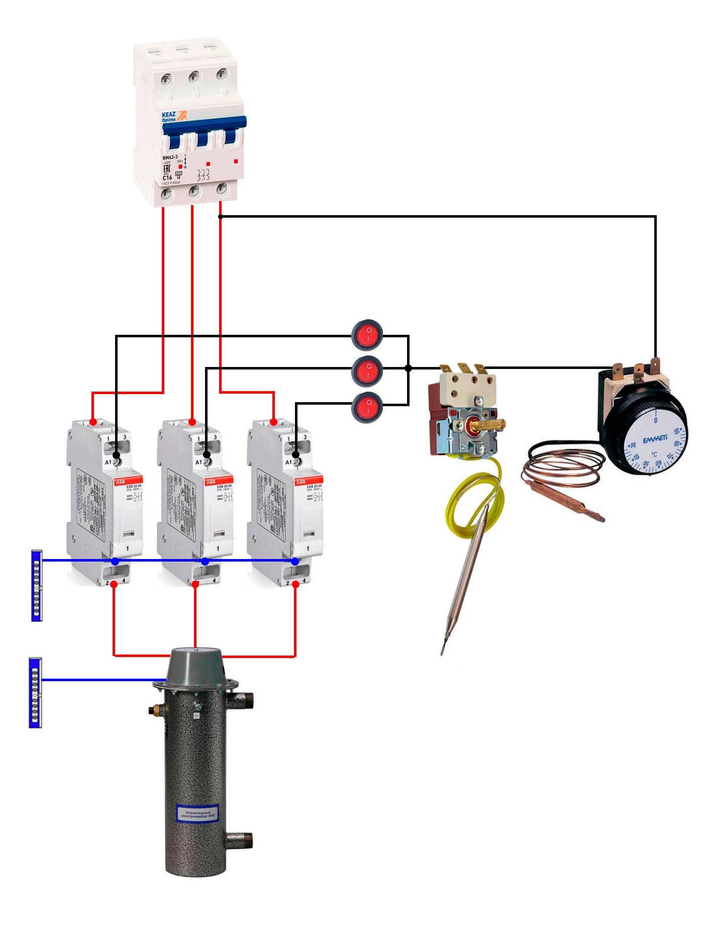 Схема подключения электрического котла к трехфазной сети более сложная, но все же под силу даже новичку.