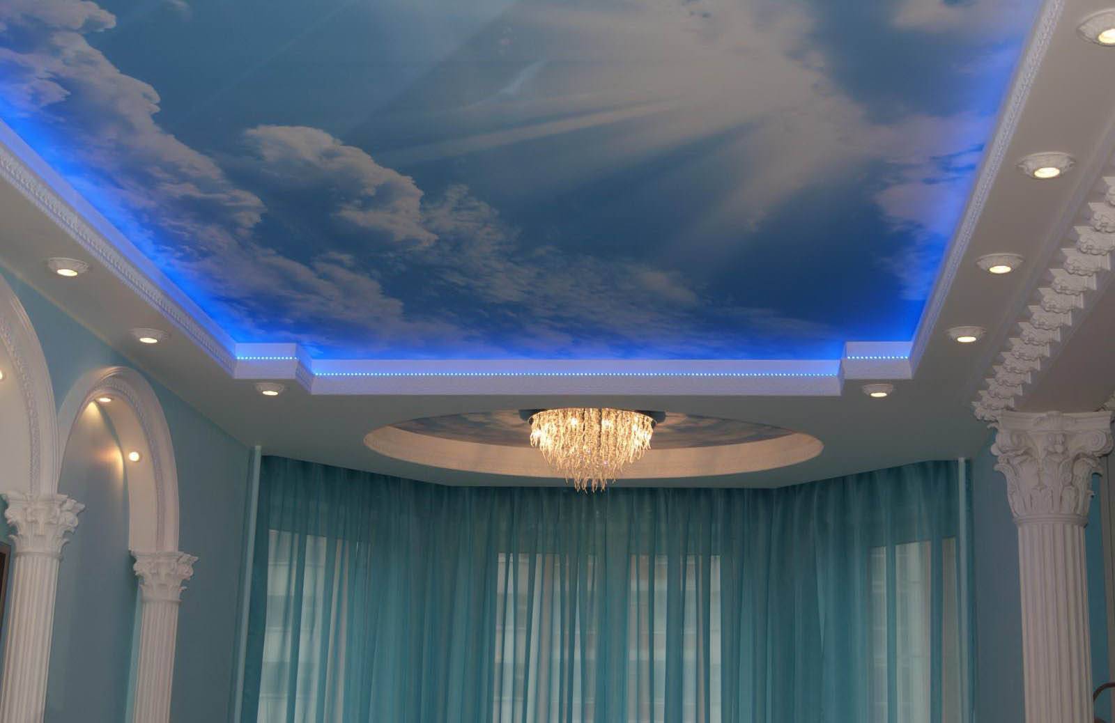 Материалом потолка служит пленка из поливинилхлорида. Данный материал имеет неоднородную прозрачность и разнообразие цветов и оттенков. Установленная подсветка хорошо видна, так как потолок пропускает свет. Эффект глубины создает вид окна или прозрачной крыши. Игра света придает неповторимости интерьеру.