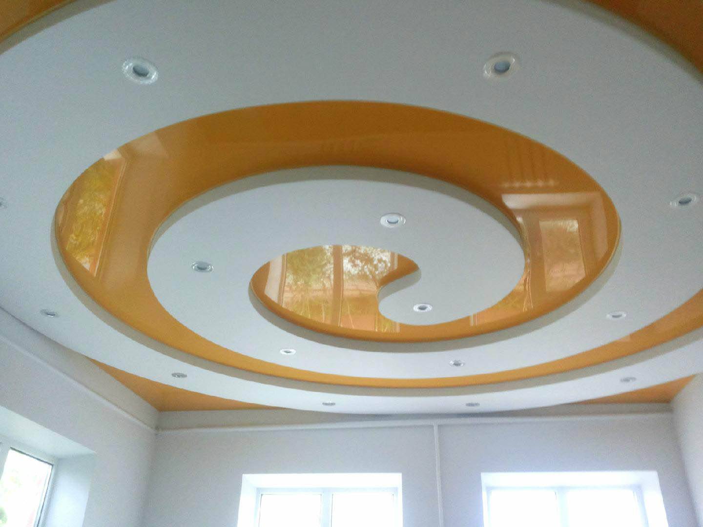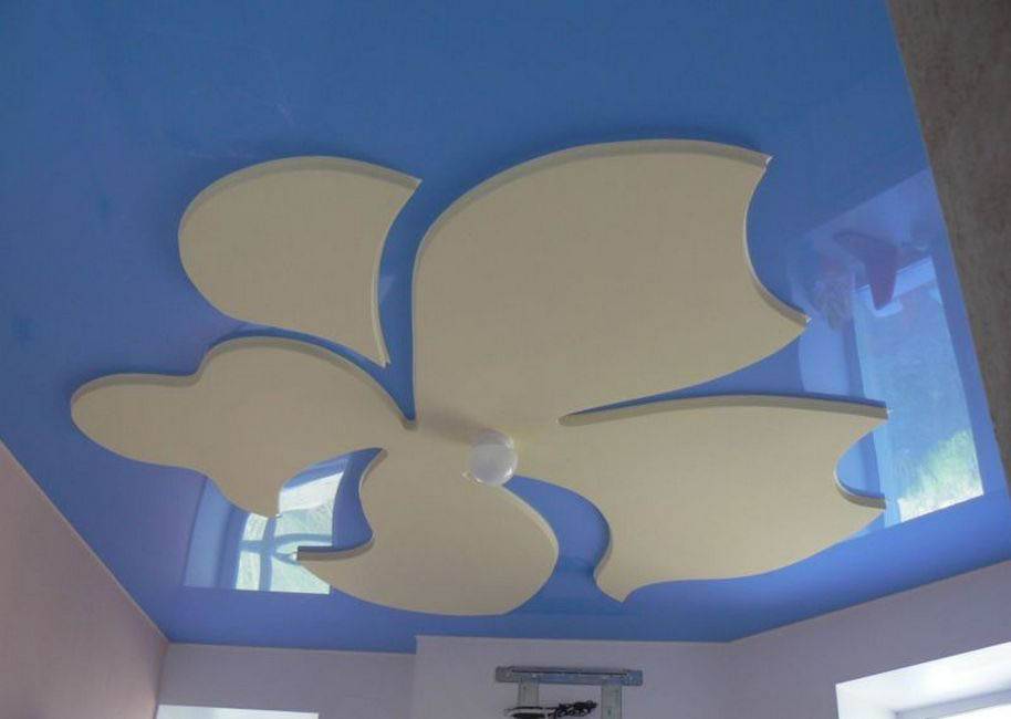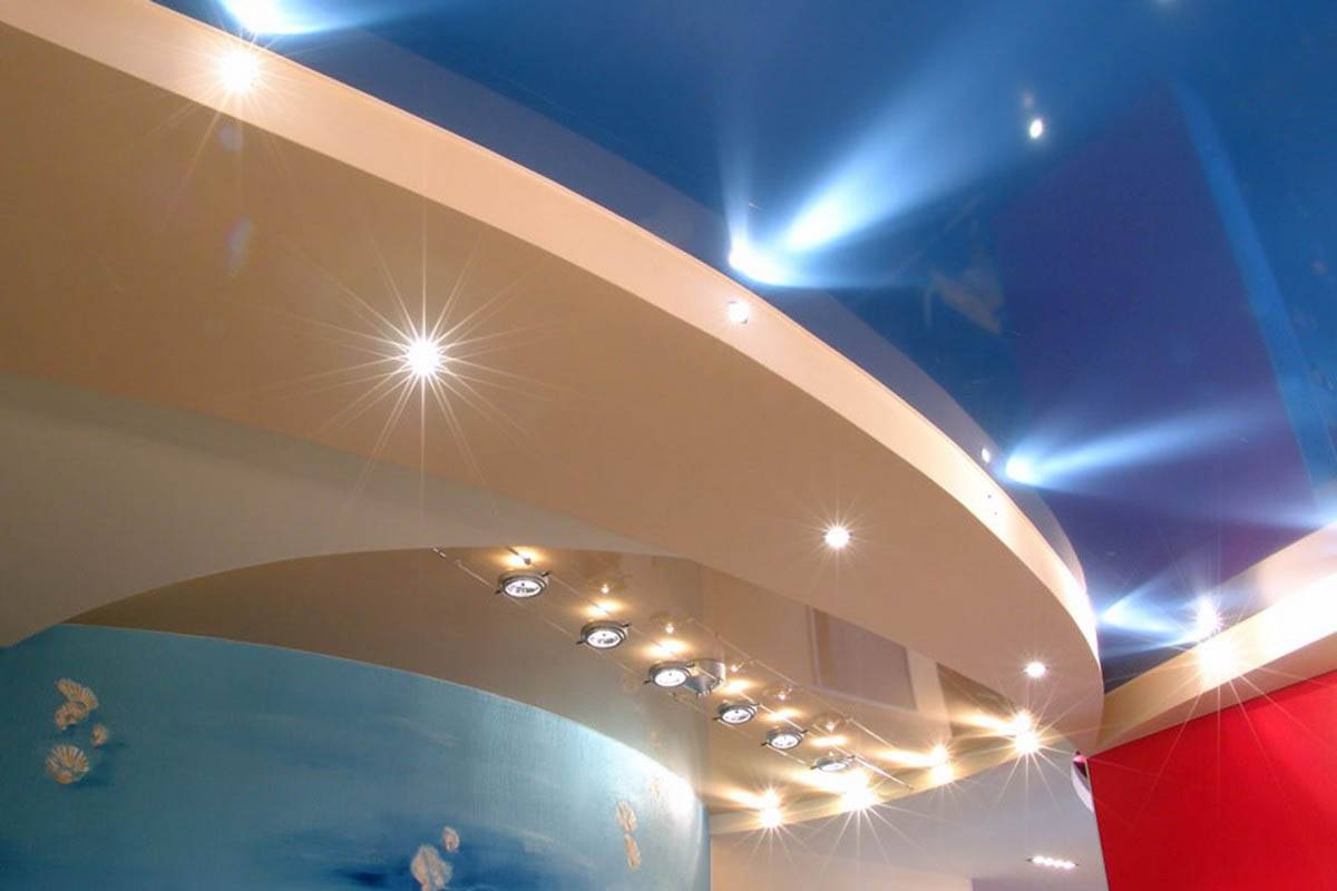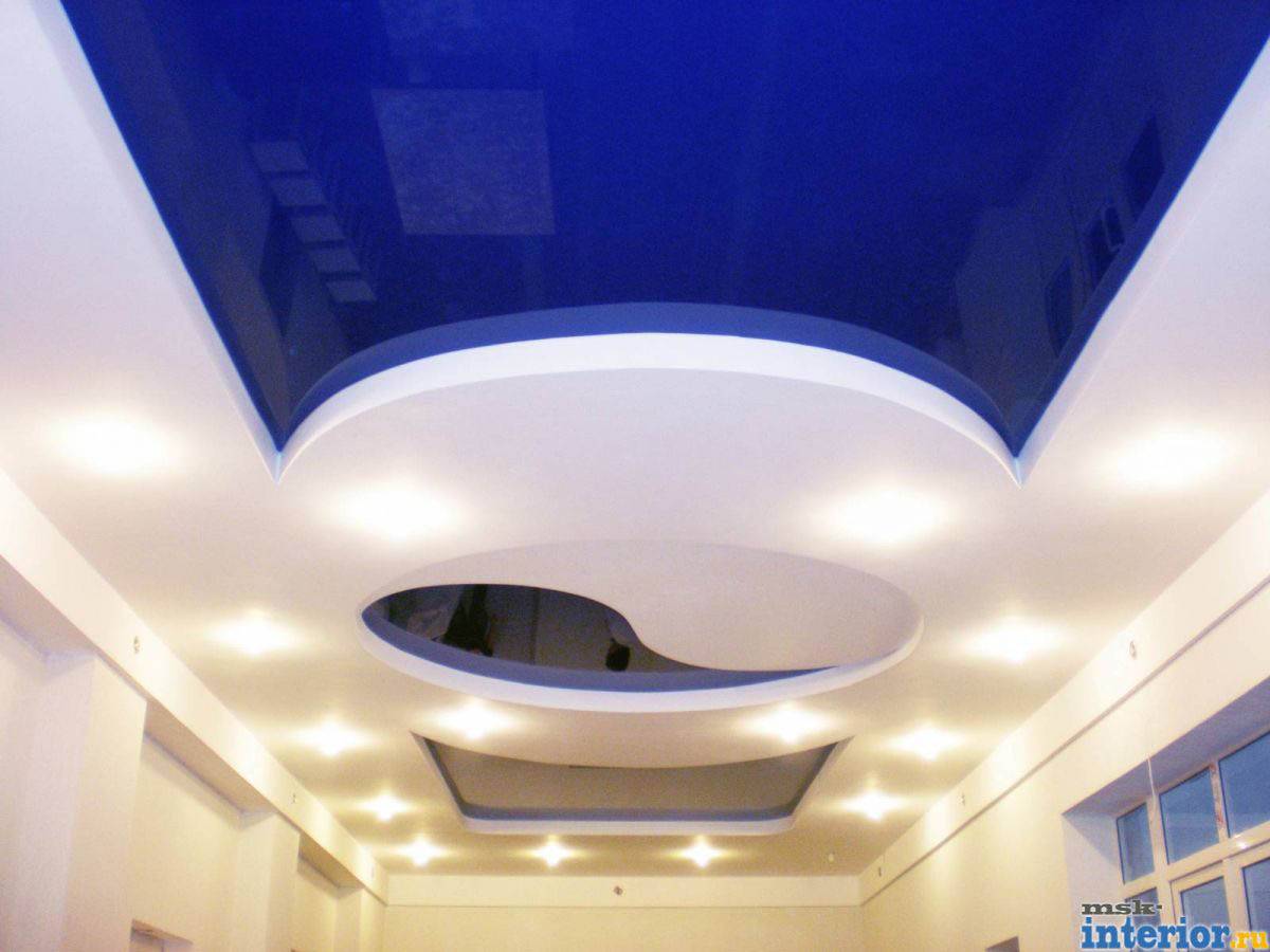 При этом участки располагаются на разных уровнях глубины, что обусловлено техническими особенностями установки натяжных потолков. Обычно пленка (или ткань) располагается выше, ближе к потолочной плите, а дополнительный цвет наносится на конструкции из гипсокартона или иных листовых материалов, выполняющих роль несущих элементов.