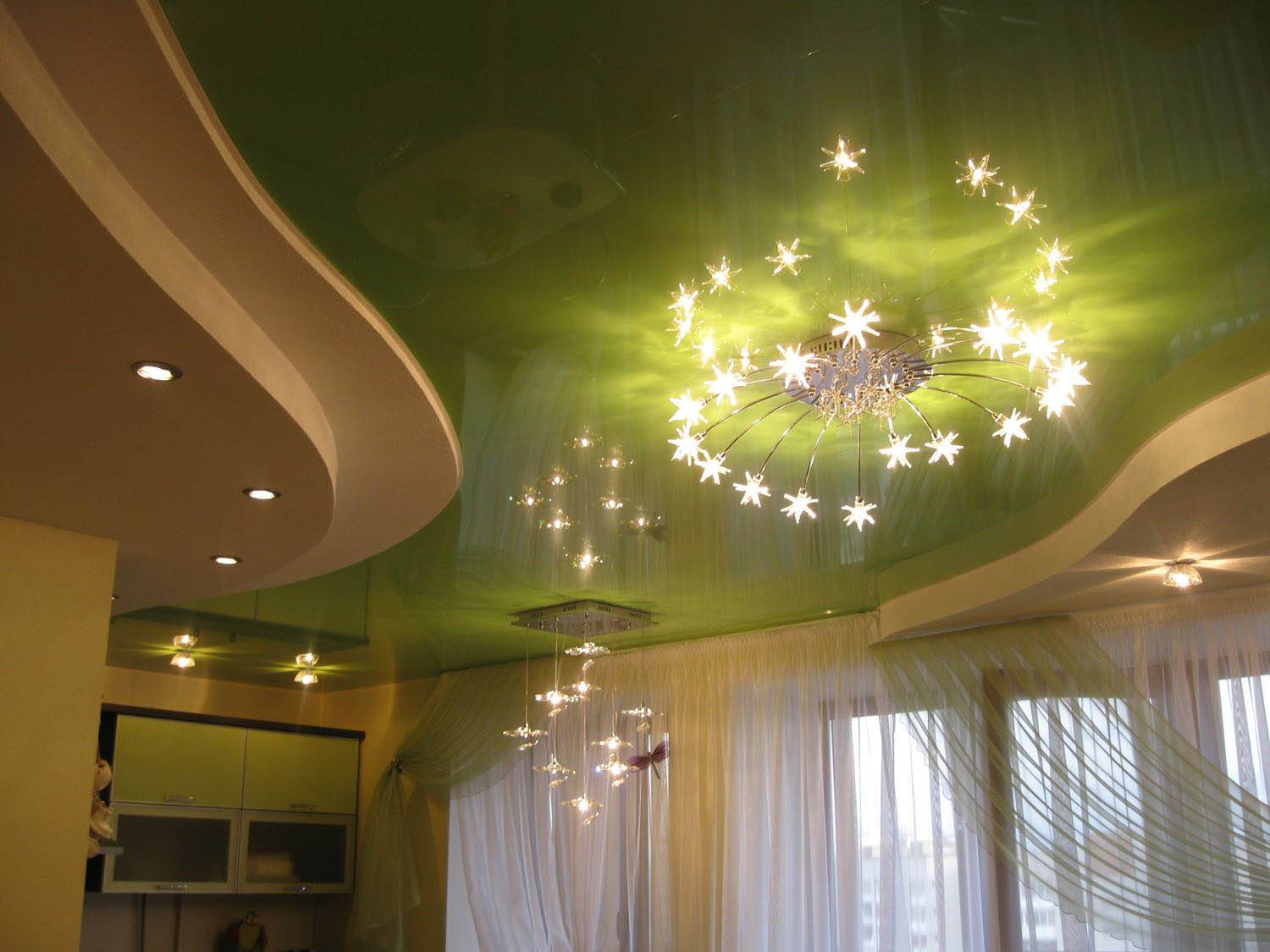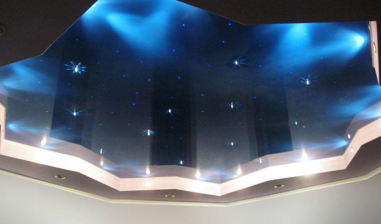 В этом виде сочетается практичность материала и роскошь результата. Такие изделия будут уместны в гостиницах, салонах красоты, ресторанах. Великолепным будет полупрозрачный потолок из нескольких уровней, где органично переплетутся разнообразие цветов и форм. Большим спросом пользуется потолок, создающий неповторимый образ звездного неба.