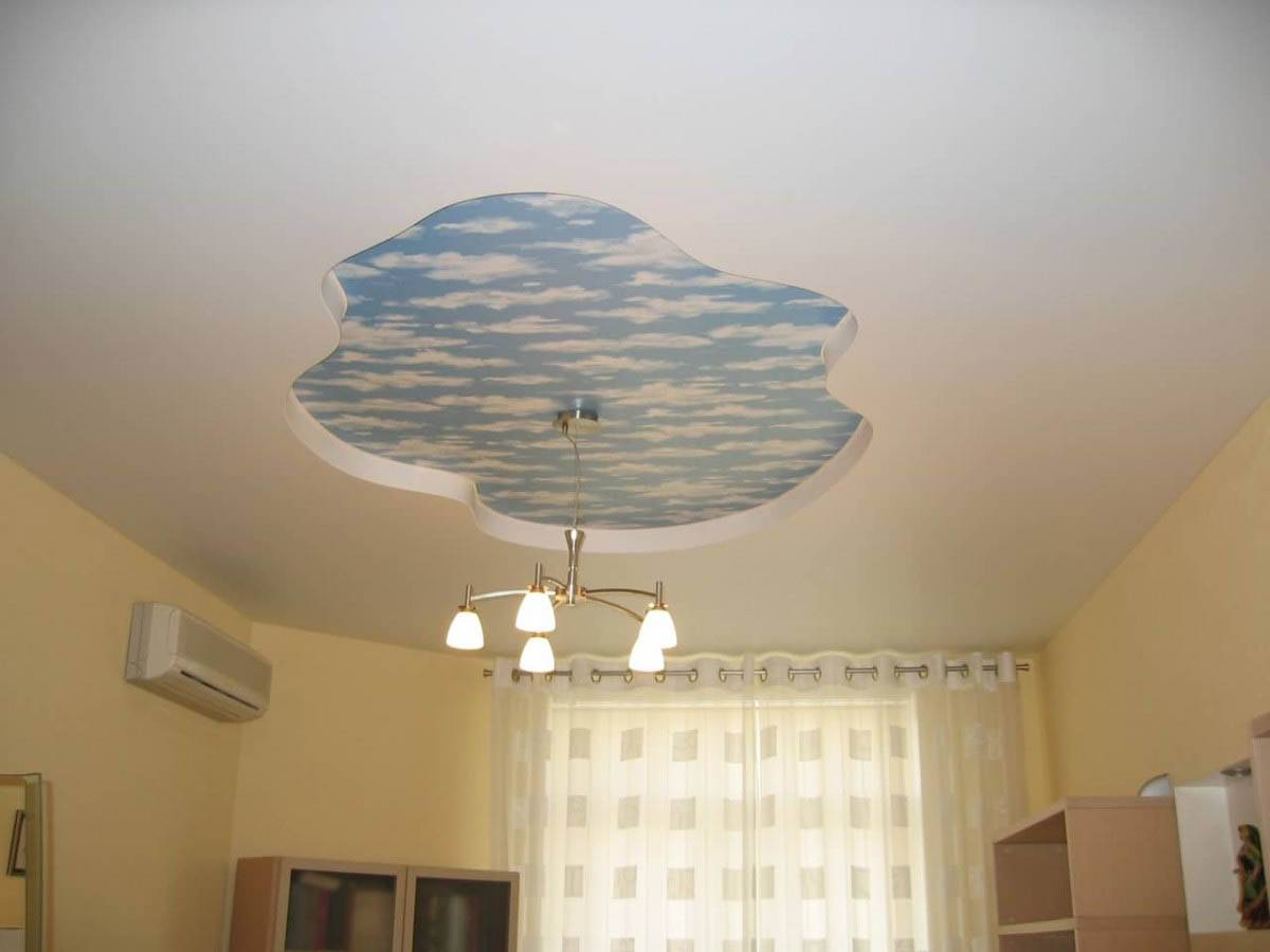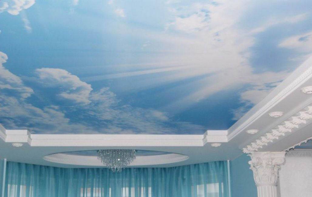 Освобождаемый таким нехитрым способом центр используется для натягивания пвх-полотна. Очень часто натяжной потолок в этом варианте становится частью общего концептуального замысла, когда выполняется его последующая отделка под звездное небо, солнечный день, облака или любой другой принт, выбранный оформителями.