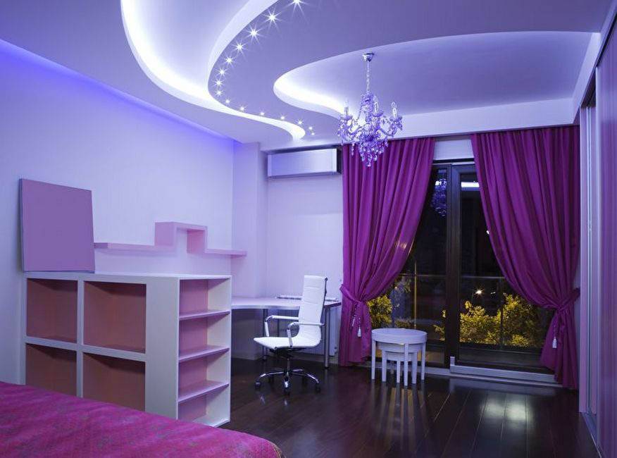 Актуальная оформительская тенденция, сдерживает которую разве что ее непрактичность в случае с использованием небольших по площади комнат. Заключается в том, что основа выполняет из листов гипсокартона и протягивается по периметру.