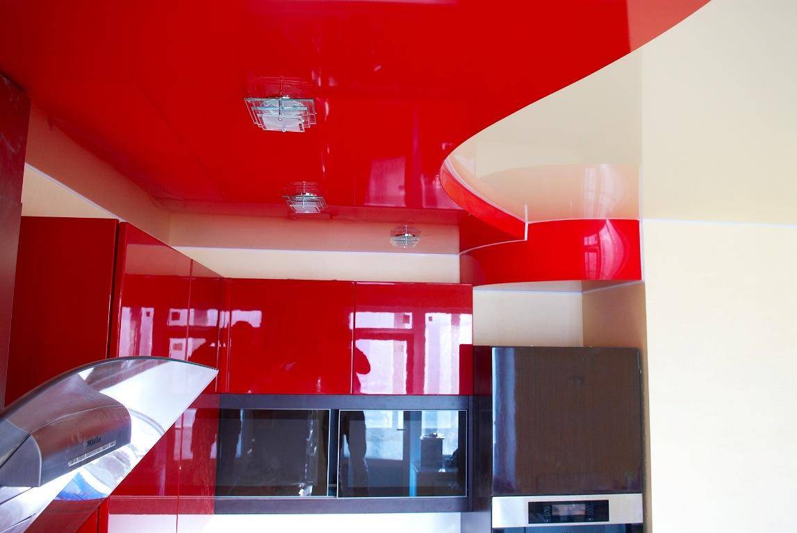 Если вы любитель оригинальных дизайнерских решений, остановите свой выбор на красных натяжных потолках. Красные потолки отлично смотрятся в интерьере кухни. В этой комнате такое оформление будет уместно лишь в том случае, если вы не используете алый кухонный гарнитур. Красный потолок в сочетании с точечными светильниками хорошо впишется в интерьер гостиной. Комната будет выглядеть роскошно и изысканно. Красный натяжной потолок хорошо сочетается с бежевой мебелью.
