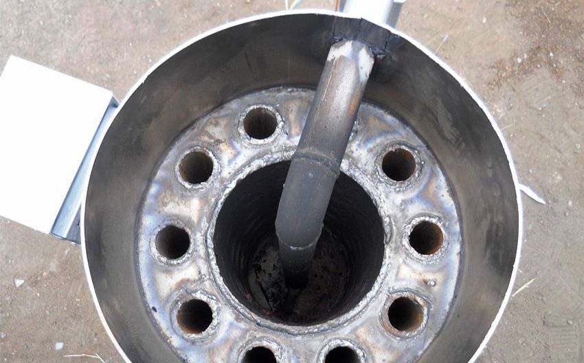 Крышка на нижний резервуар должна одеваться очень плотно, не должно быть зазоров. В крышке есть круглое отверстие посередине, к нему приваривается труба-горелка, которая соединяет 2 резервуара. Эта труба должна быть не меньше 10 см в диаметре, а ее длина не меньше 35 см. В соединительной трубе печи следует просверлить отверстия 9-10 мм (рис.5), их должно быть около 50 шт. сверлить отверстия нужно равномерно по рядам.