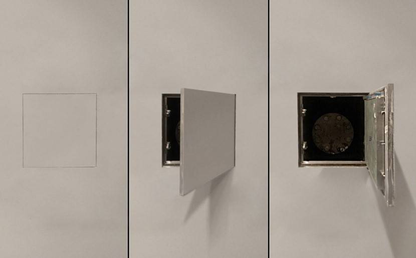 Дверца сначала слегка выдвигается вперед, а потом открывается. Это гарантирует безопасное открывания люка, даже если он установлен в углу комнаты.